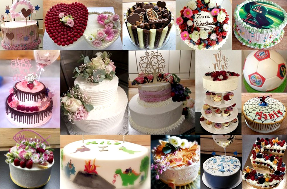 Ob dreistöckig, eckig, mit frischen Früchten und Blumen oder einfach ganz schlicht – der Phantasie sind keine Grenzen gesetzt! Ein paar Anregungen haben wir schon zusammen gestellt, ein kleiner Auszug individueller Torten, die auf Kundenwunsch gefertigt wurden.